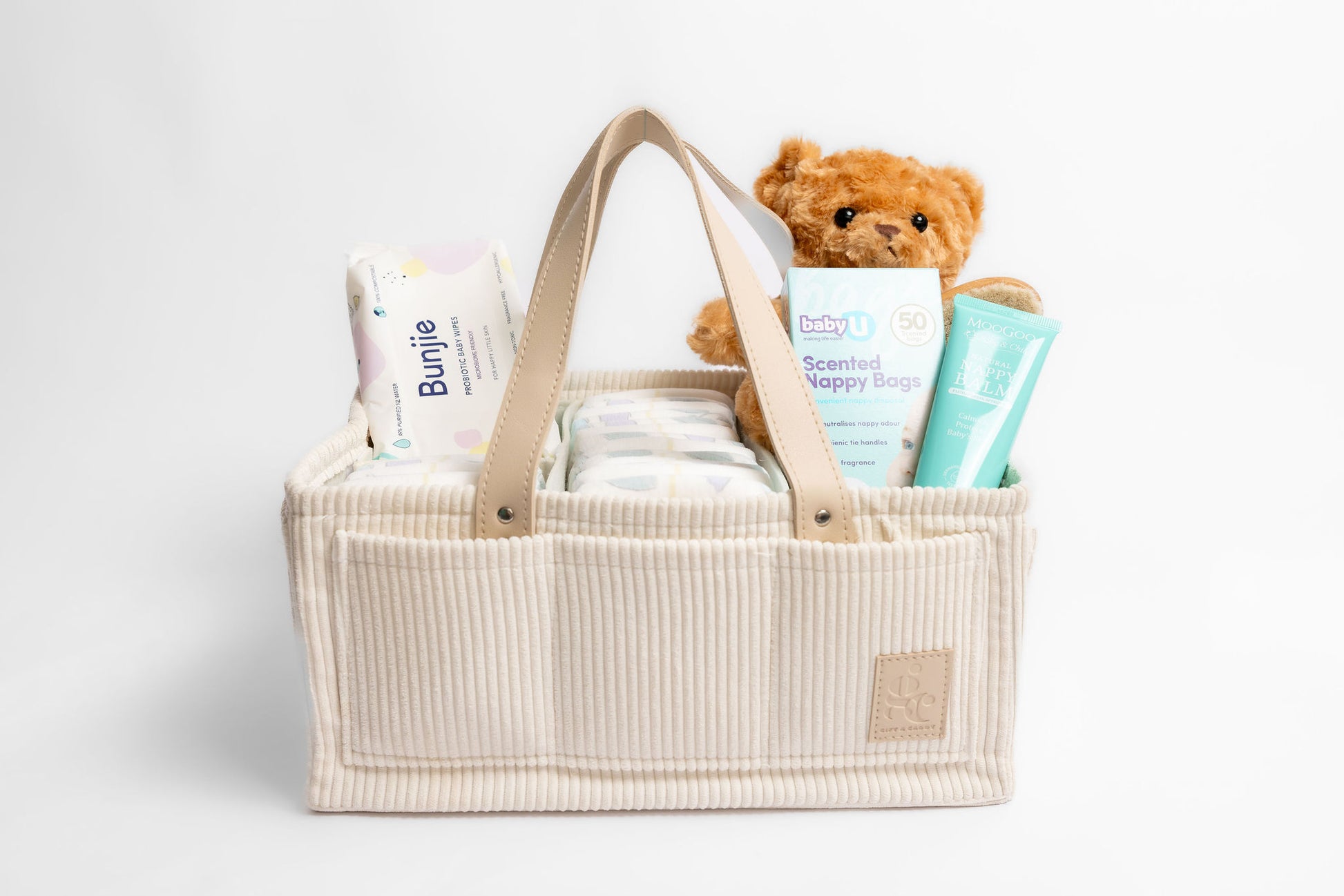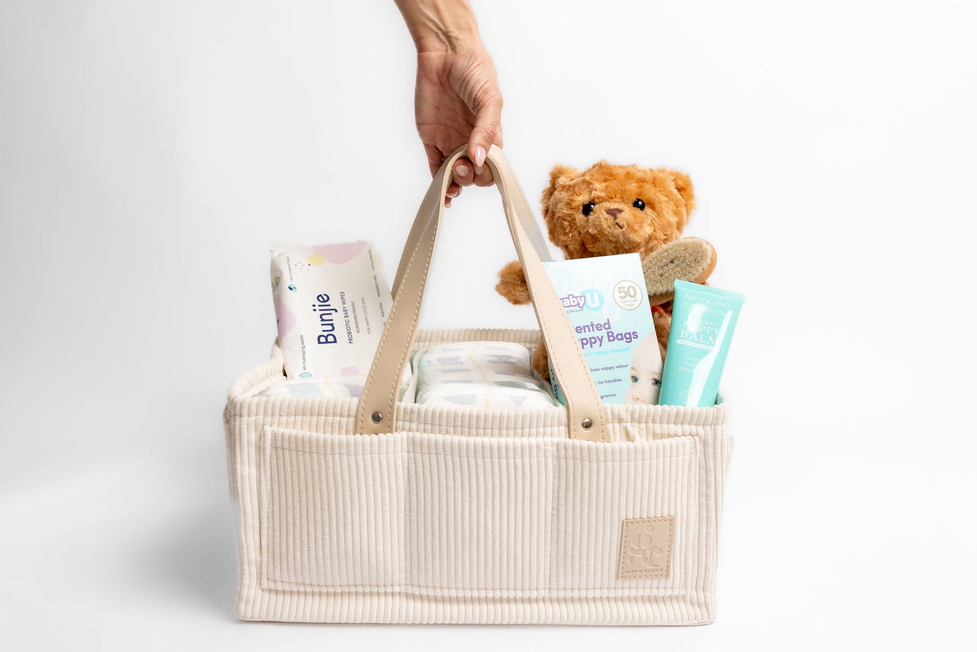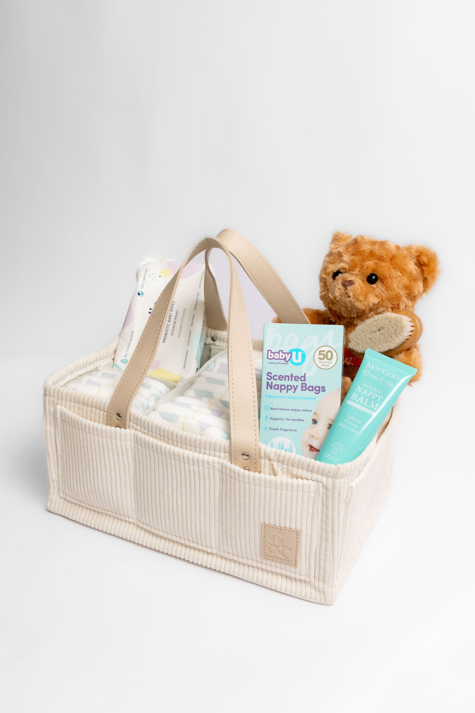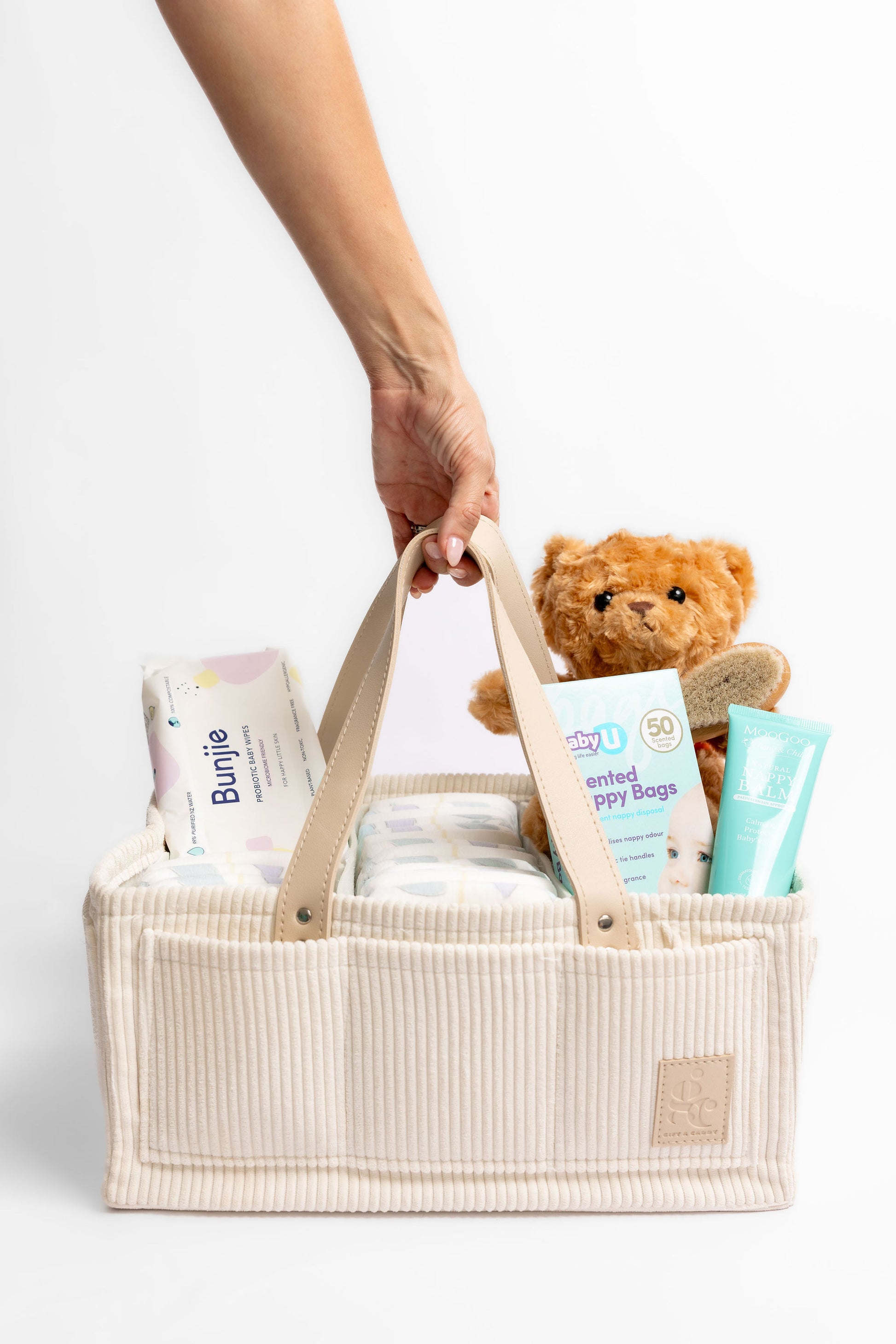 This Corduroy Nappy Caddy comes in White with cream vegan leather handles