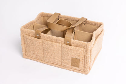 Our caddy is made from high quality teddy velvet fabric, designed with strong vegan leather handles, The lining is also waterproof, it's removable and washable.